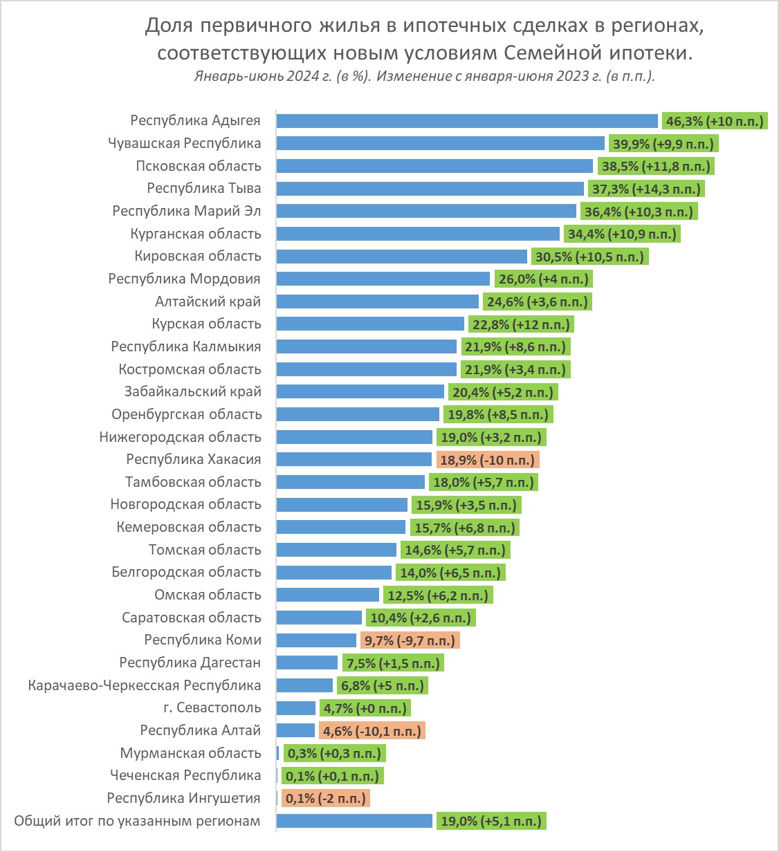 По доле первичного рынка в общей структуре выдач лидируют Республика Адыгея (46,3%), Чувашская Республика (39,9%), Псковская область (38,5%), Республика Тыва (37,3%), Республика Марий Эл (36,4%), Курганская (34,4%) и Кировская (30,5%) области. Эксперты отмечают, что по сравнению с первым полугодием 2023 года доля первичного рынка в этих субъектах выросла на 10 п. п. и больше.