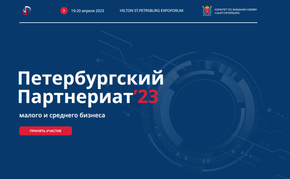 С 19 по 20 апреля 2023 года в КВЦ «Экспофорум» состоится XVI Петербургский Партнериат малого и среднего бизнеса «Санкт-Петербург – регионы России и зарубежья», организатором которого выступает Правительство Санкт-Петербурга.