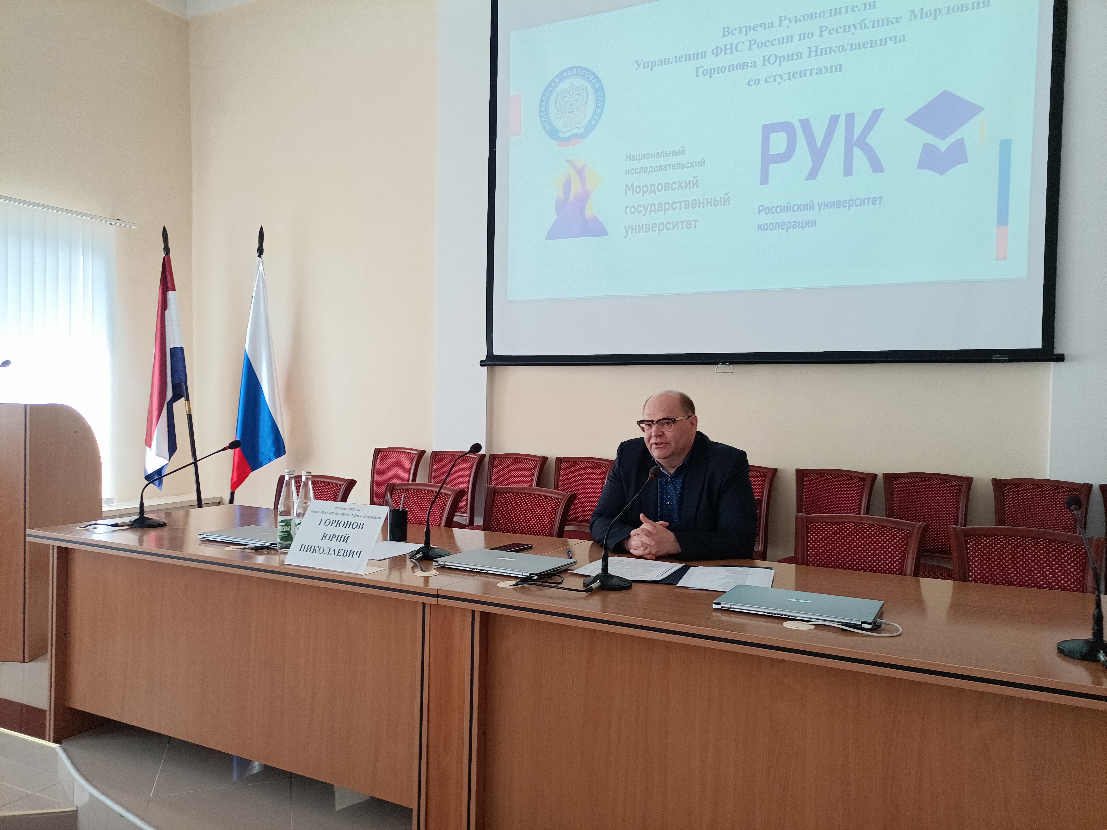 Руководитель УФНС России по Мордовии Юрий Горюнов встретился со студентами НИ МГУ имени Н.П. Огарева и Саранского кооперативного института (филиала) Российского университета кооперации.