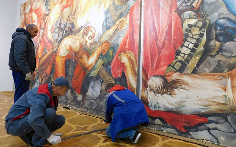 Героическое панно два десятилетия украшало фойе второго этажа Республиканского Дворца культуры профсоюзов, который позже получил статус РДК, а монументальную роспись в процессе его реконструкции, увы, демонтировали.