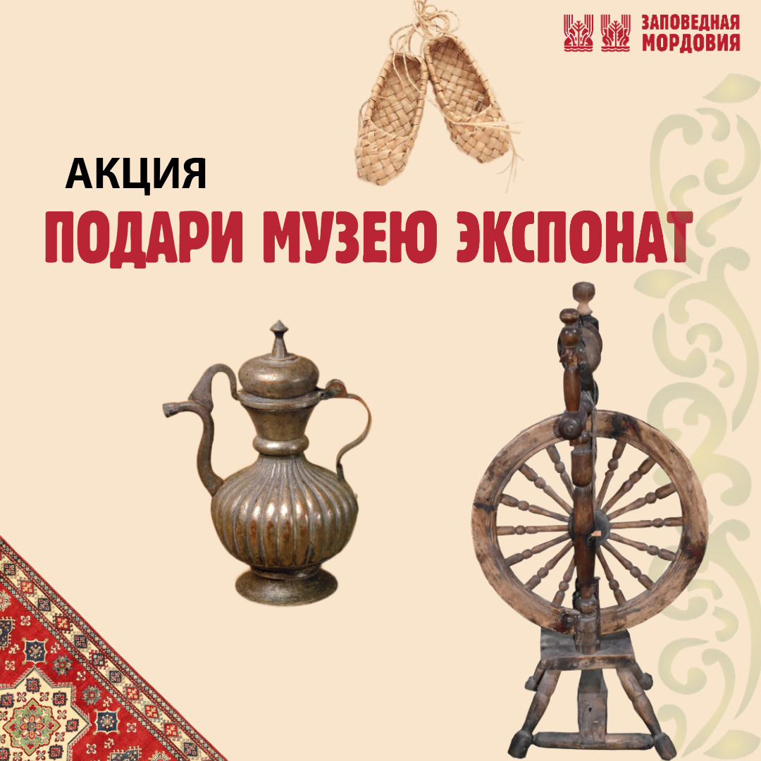 Подарите музею экспонат, связанный с местной культурой и традициями.Мы будем рады предметам национальной одежды русских, татар, мокши и эрзи, аксессуарам, музыкальным инструментам, картинам, изделиям декоративно-прикладного искусства, старинным предметам быта…Информация об экспонате и о дарителе будет внесена в документацию музея