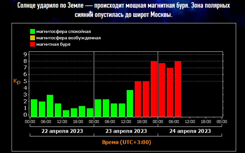 Отмечается, что мощная магнитная буря уровня G4, то есть четвертый класс из пяти возможных, происходит и сейчас. Началась она накануне около пяти вечера, вышла на максимум около 11 одиннадцати вечера и сохраняется примерно на том же уровне.