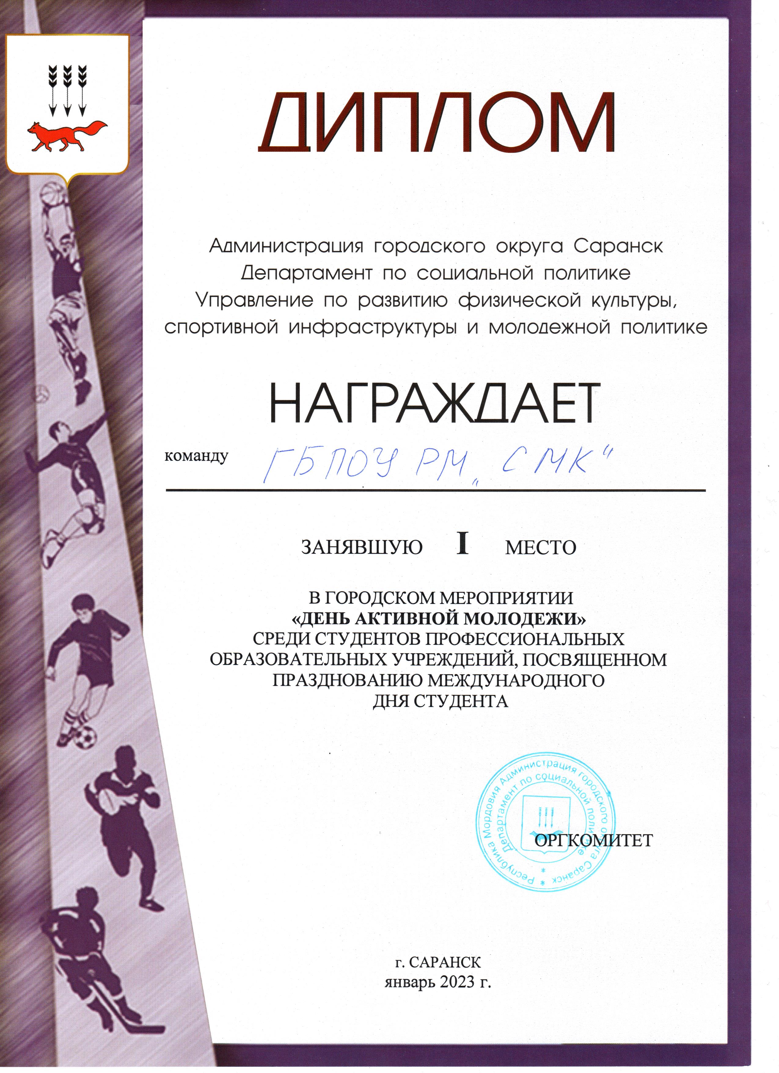 26 января 2023 года Управлением по развитию физической культуры, спортивной инфраструктуры и молодежной политике Департамента по социальной политике Администрации городского округа Саранск было проведено городское мероприятие «День активной молодежи» среди студентов профессиональных образовательных учреждений городского округа Саранск, посвященное празднованию Международного Дня студента.