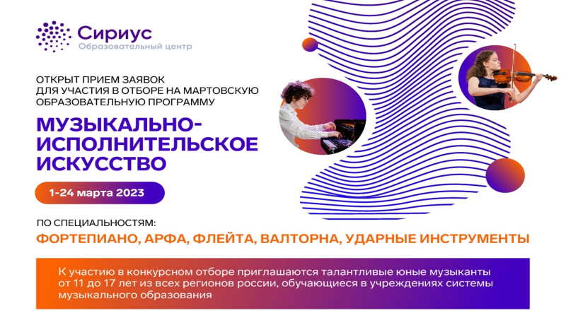 Центр «Мира» проводит конкурсный отбор на образовательную программу «Музыкально-исполнительское искусство», которая пройдет с 1 по 24 марта на базе Образовательного центра «Сириус». Программа позволит талантливым школьникам совершенствовать профессиональные навыки инструментального исполнительства по следующим специальностям: фортепиано, арфа, флейта, валторна, ударные инструменты. Она рассчитана на юных музыкантов 11-17 лет из всех регионов страны.