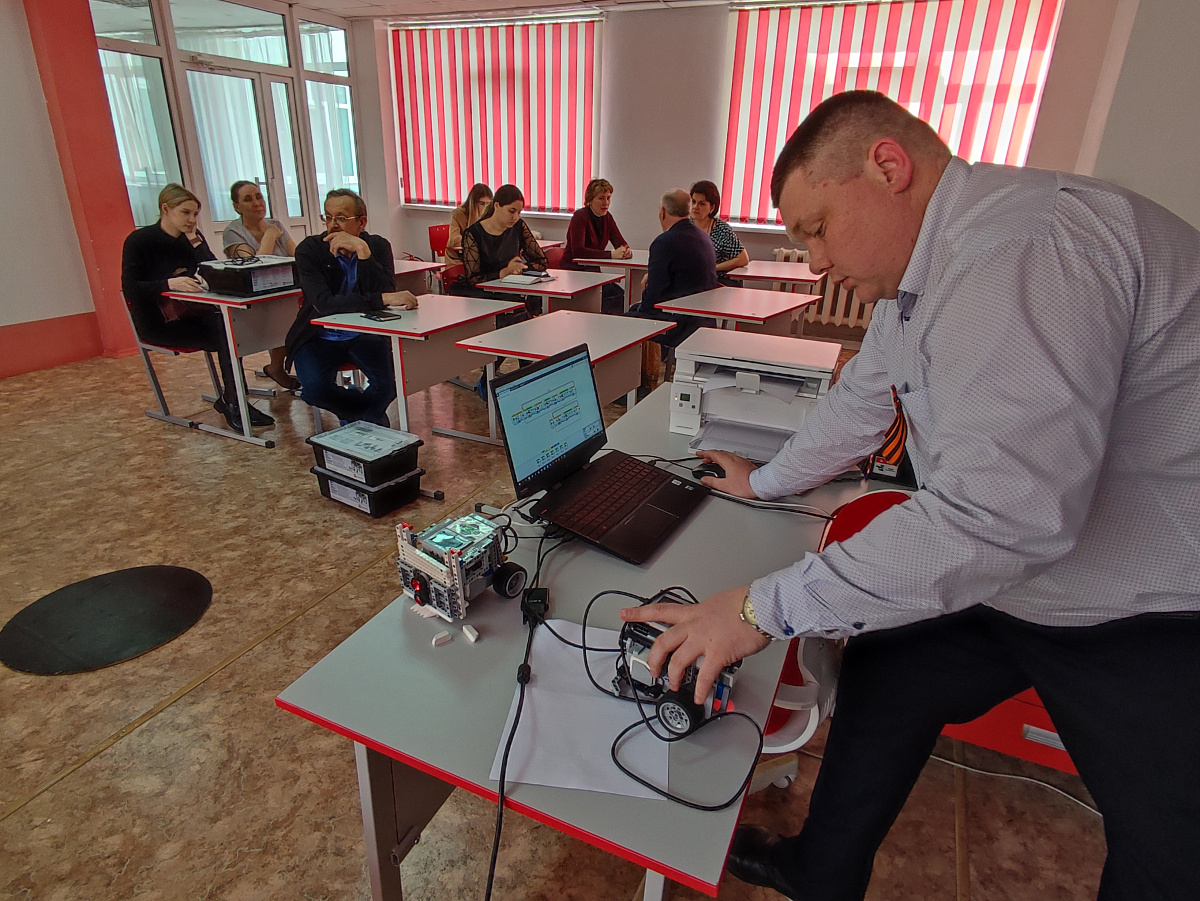 Доцент кафедры информационной безопасности и сервиса Антон Волков провёл для учителей школы открытую лекцию «Робототехника в школе», в ходе которой были рассмотрены вопросы использования в образовательном процессе различных робототехнических наборов, конструкции и узлы учебных роботов, приемы их программирования.