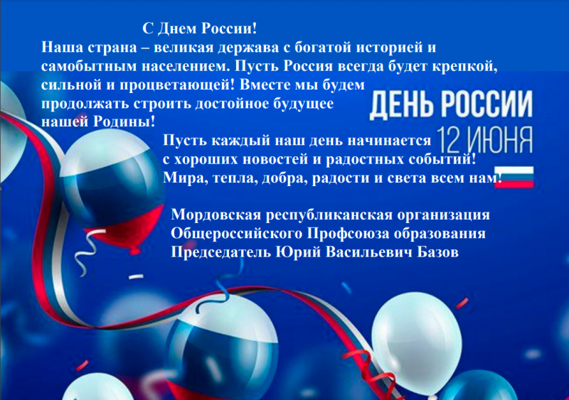 ПОЗДРАВЛЕНИЕ ПРЕДСЕДАТЕЛЯ МОРДОВСКОЙ РЕСПУБЛИКАНСКОЙ ОРГАНИЗАЦИИ ОБЩЕРОССИЙСКОГО ПРОФСОЮЗА ОБРАЗОВАНИЯ Ю.В. БАЗОВА С ДНЕМ РОССИИ!