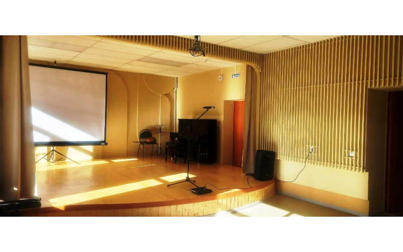 И актовый зал совсем не узнать: светлый, не слишком большой, но достаточно просторный, с дизайнерски оригинально оформленным сценическим подиумом и амфитеатром. В зрительном зале разместилось 55 уютных мягких кресел, выделена площадка для колясочников. На втором этаже разместится зал хореографии.