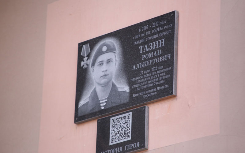 В Саранске открылась мемориальная доска в память о Романе Тазине, выпускнике экономического факультета МГУ им. Н. П. Огарева, погибшего при исполнении воинского долга в ходе СВО.