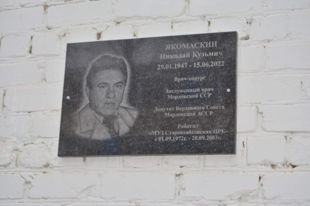 Старошайговской районной больнице присвоили имя хирурга, Заслуженного врача Мордовской АССР Николая Кузьмича Якомаскина. Как сообщает глава района Геннадий Мухин, в пятницу, 27 января, состоялось открытие мемориальной доски на фасаде здания больницы. На торжественный митинг собрались сотни жителей и гостей района. Из Москвы приехал сын Николая Кузьмича, заведующий отделением ГКБ им. С. П. Боткина Виктор Якомаскин.