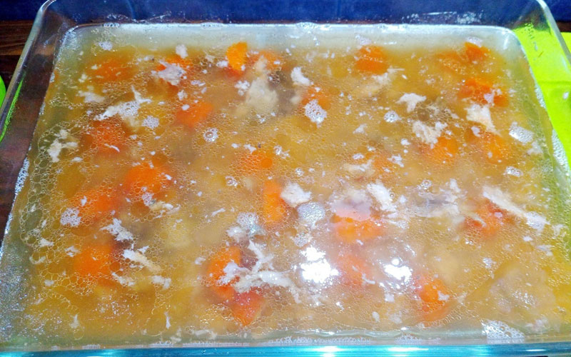 Даём немного остыть, добавляем яичные белки, лук, петрушку, морковь и кипятим бульон до тех пор, пока он не станет совсем прозрачным. Затем ещё раз процедите его через марлю, даём остыть до комнатной температуры.