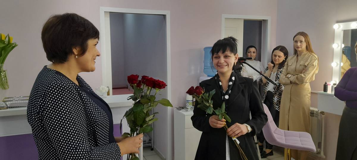 Первыми в салон пришли Юлия и Лариса. Они поблагодарили организаторов акции и пожелали всем мира, а своим мужьям победы и благополучного возвращения домой. Ольга Сергушина вручила женщинам букеты цветов.