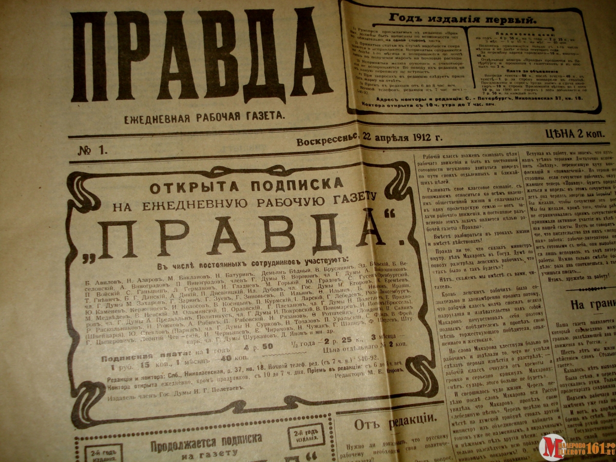 Дорогие товарищи! 5 мая 1912 года вышел в свет первый номер газеты «Правда».