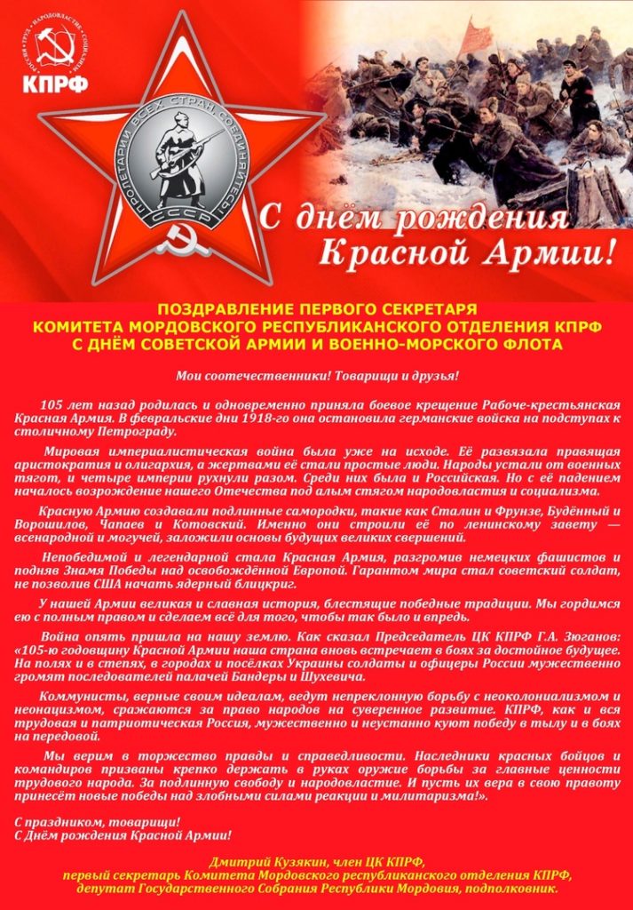 ПОЗДРАВЛЕНИЕ ПЕРВОГО СЕКРЕТАРЯ КОМИТЕТА МОРДОВСКОГО РЕСПУБЛИКАНСКОГО ОТДЕЛЕНИЯ КПРФ С ДНЁМ СОВЕТСКОЙ АРМИИ И ВОЕННО-МОРСКОГО ФЛОТА!