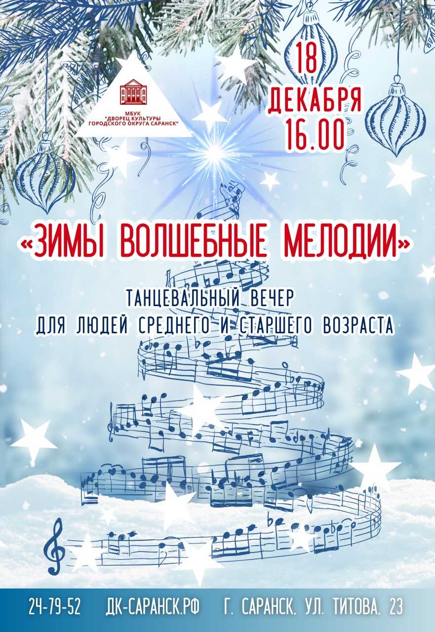 18 декабря 2024 года в 16.00 во Дворце культуры городского округа Саранск состоится танцевальный вечер «Зимы волшебные мелодии» для людей среднего и старшего поколения в рамках любительского объединения «Ретро-танцплощадка».
