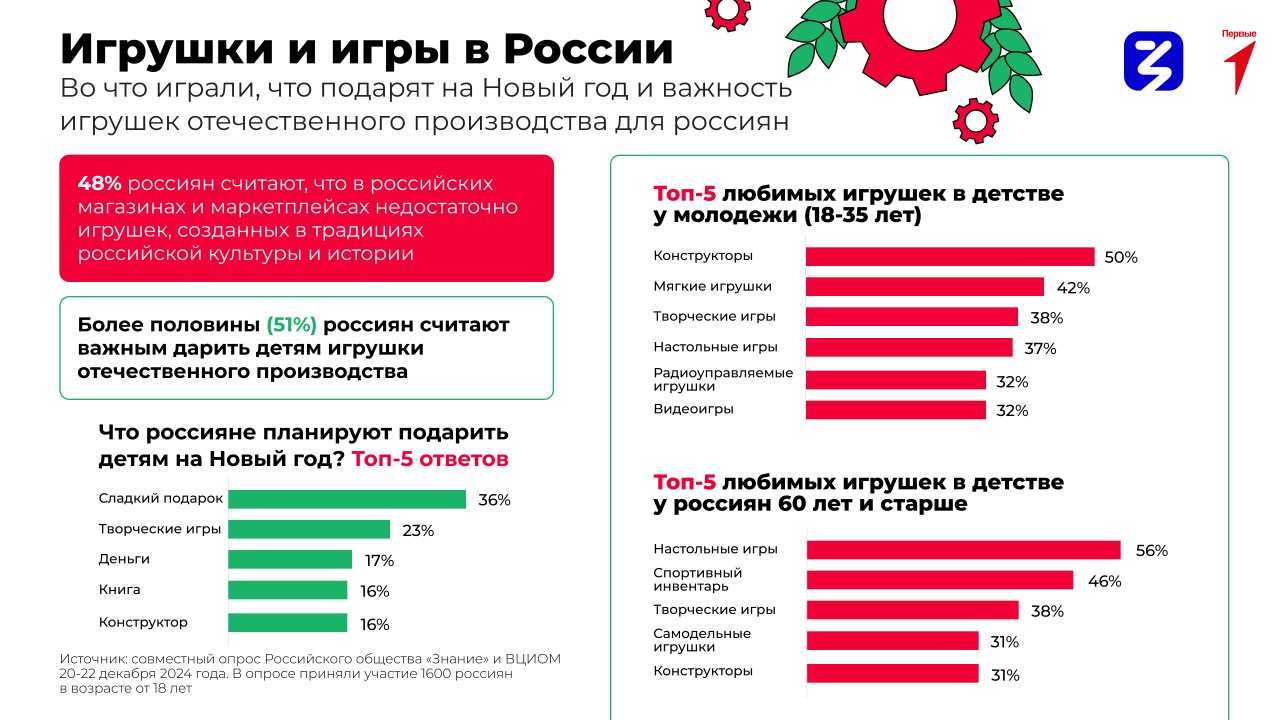 Не остался без внимания и вопрос о доступности игрушек отечественного производства. Практически каждый второй респондент считает, что в российских магазинах недостаточно игрушек, созданных в традициях российской культуры и истории (48%) (сказок, фольклора, народных персонажей), и примерно каждый третий (35%) говорит о том, что таких игрушек достаточно Кроме того, половина опрошенных (51%) считают важным дарить детям на Новый год игрушки отечественного производства. Это говорит о потребности в поддержке местного производства и сохранении культурного наследия через индустрию игрушек.