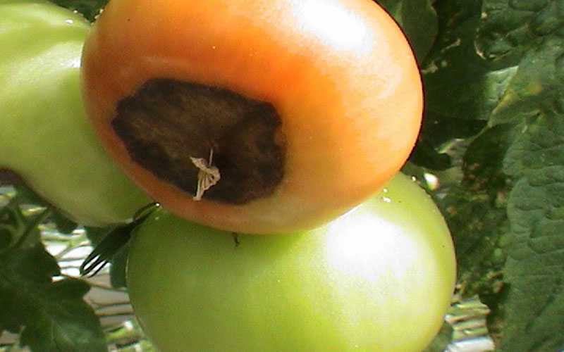 Не стоит впадать в панику. Такие пятна — признак вершинной гнили помидор, которая не является их заразным заболеванием. Это сигнал, что плодам не хватает кальция. Если в другие части помидор кальций поступает прежде всего, то к вершинам плодов, на которых появляются такие пятна, его путь самый долгий. Не из-за того, что кальция не хватает в почве, а из-за недостаточного испарения с растений влаги через листья. Поэтому не старайтесь обрывать у помидор листья. Они помогают испарять с кустов влагу, и кальций вместе с испаряющейся влагой будет поступать в плоды.