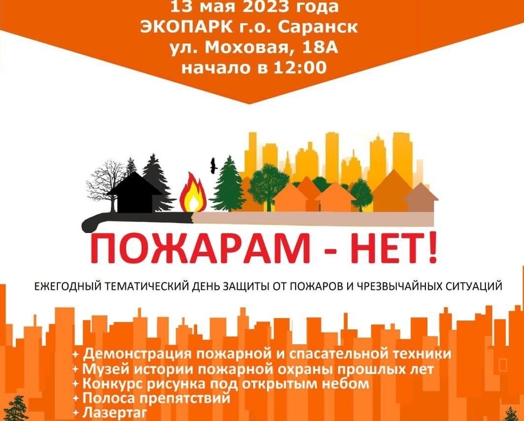13 мая в Экопарке г.о. Саранск (ул. Моховая 18А) состоится Ежегодный тематический день защиты от пожаров и чрезвычайных ситуаций "Пожарам - нет!"