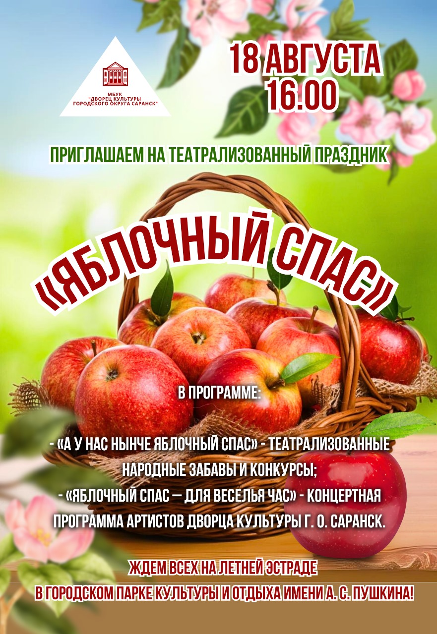 18 августа в 16.00 приглашаем жителей и гостей города Саранска на театрализованный праздник «Яблочный Спас», который состоится в Парке культуры и отдыха им. А. С. Пушкина (Летняя эстрада).