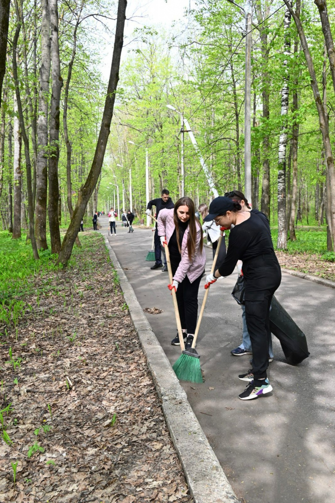 Территория преображается на глазах: трудовой коллектив администрации Ленинского района и активные жители подметают дорожки, собирают мусор в мешки, после чего он будет вывезен.