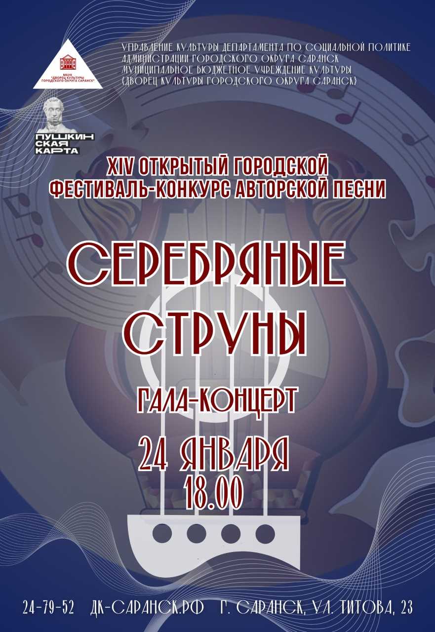 24 января в 18.00 ч. во Дворце культуры городского округа Саранск состоится Гала-концерт XIV Открытого городского фестиваля-конкурса авторской песни «Серебряные струны».