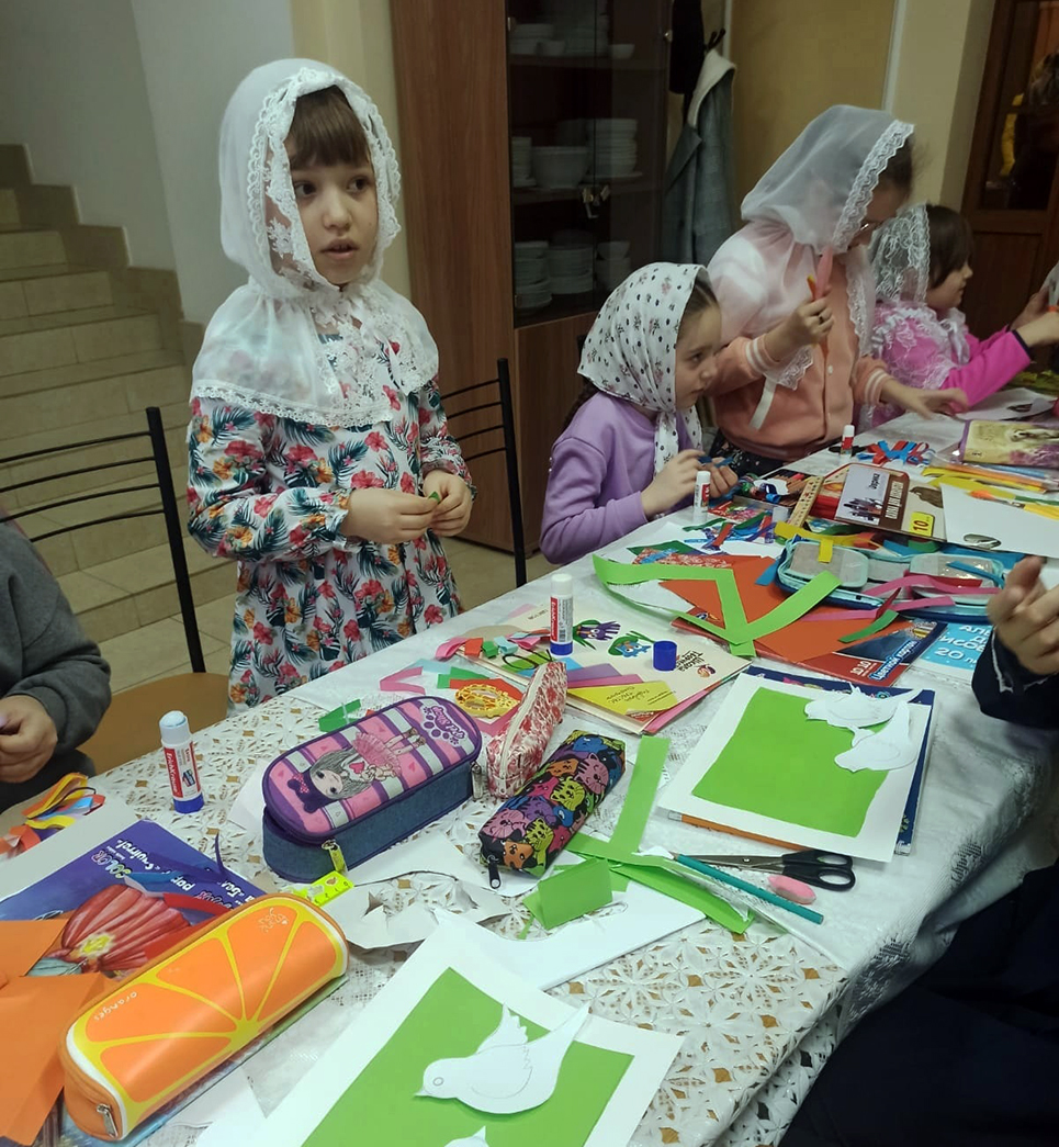 7 апреля воспитанники Воскресной школы храма святых равноапостольных Мефодия и Кирилла, Учителей Словенских, в Саранске на уроке изобразительного искусства сделали праздничные открытки и бумажных голубей.