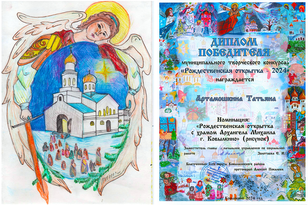 Вот как бывает! Второе Ковылкинское благочиние проводило замечательный конкурс «Рождественская открытка – 2024». На него была подана чудесная работа с изображением Ковылкинского Михаило-Архангельского храма. Об авторе были известны только имя и возраст: Татьяна Артамошкина, 11 лет. Организаторам пришлось искать ее через соцсети.