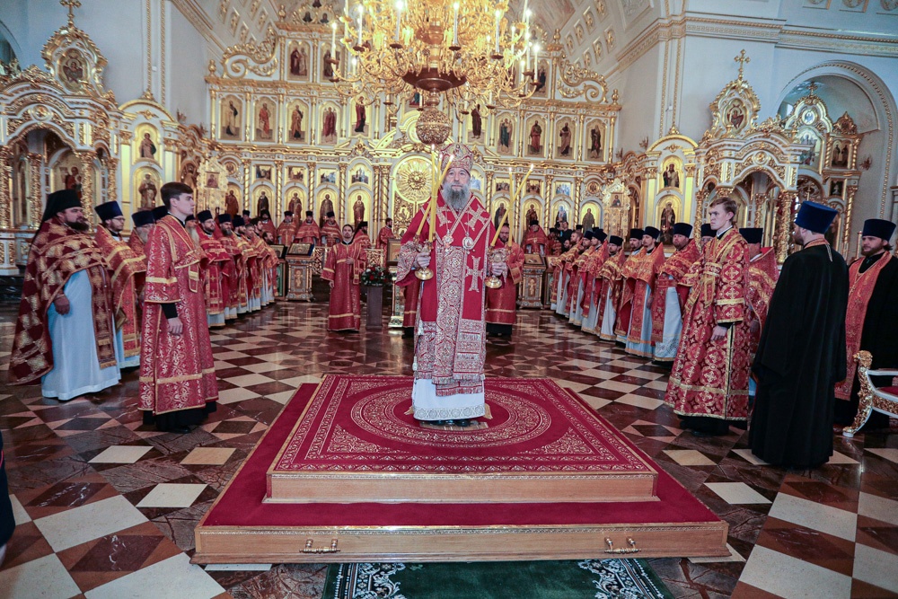 За Литургией Его Высокопреосвященству сослужили благочинные епархии, настоятели монастырей, ректорат и преподаватели Саранской Духовной Семинарии, руководители епархиальных отделов и комиссий в священном сане, клирики саранских приходов.