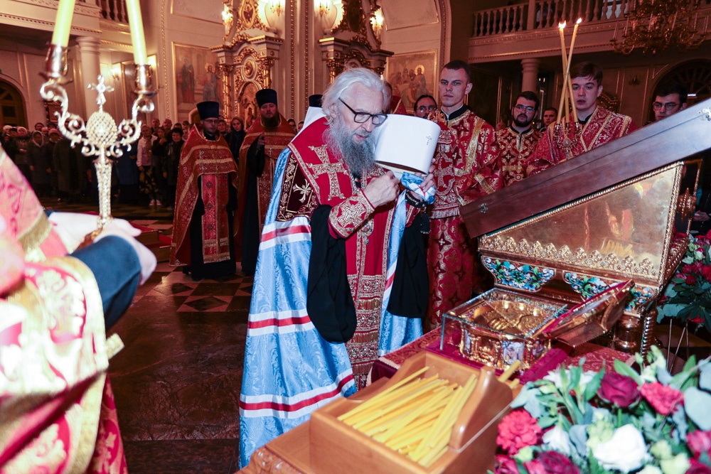 По окончании богослужения митрополит Зиновий совершил молебен перед ковчегом с мощами, прочитал молитву, после чего святыню торжественно на руках пронесли до микроавтобуса. Вышедшие на крыльцо и на площадь перед собором верующие проводили её в следующий город.