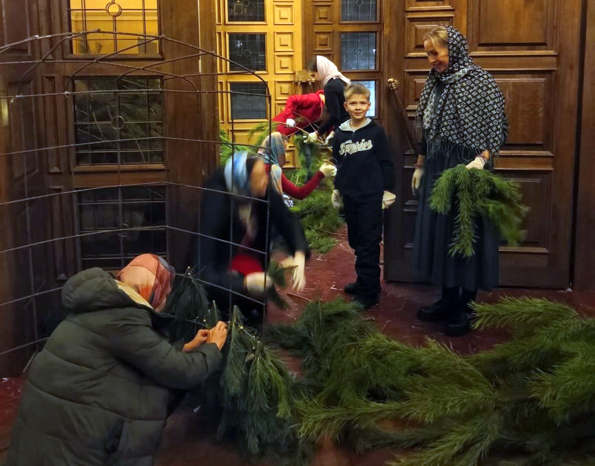 «В эти минуты активисты молодежной группы и воспитанники воскресной школы мастерят в храме святых равноапостольных Мефодия и Кирилла, Учителей Словенских , рождественский вертеп из сосновых веток, внутри которого будет находиться праздничная икона Рождества Христова», – сообщают в Юго-Западном благочинии.