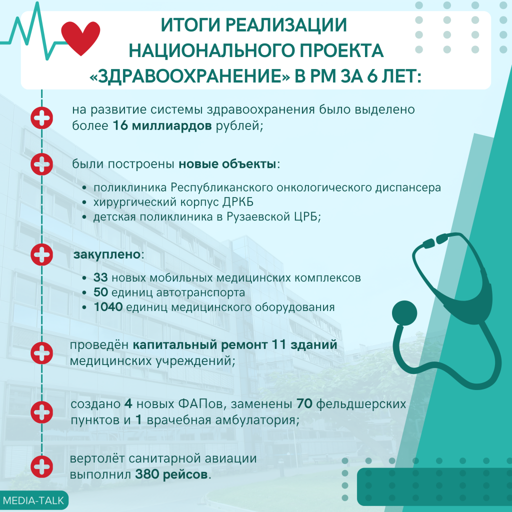 Министр здравоохранения региона Олег Маркин подчеркнул, что ключевыми целями являются улучшение демографической ситуации и поддержание здоровья граждан. В 2024 году завершился шестилетний период реализации национального проекта «Здравоохранение». За это время на развитие системы здравоохранения Мордовии было выделено более 16 миллиардов рублей. В рамках проекта были построены новые объекты: поликлиника Республиканского онкологического диспансера, хирургический корпус Детской республиканской клинической больницы и детская поликлиника в Рузаевской центральной районной больнице. Кроме того, был проведён капитальный ремонт 11 зданий медицинских учреждений в регионе. Также было закуплено 33 новых мобильных медицинских комплексов, 50 единиц автотранспорта и 1040 единиц медицинского оборудования. В рамках проекта было создано 4 новых ФАПов, заменены 70 фельдшерских пунктов и 1 врачебная амбулатория. Вертолёт санитарной авиации выполнил 380 рейсов.