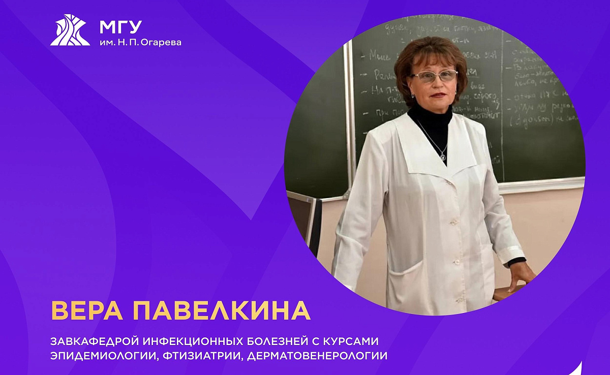 Указом Президента РФ за заслуги в научно-педагогической деятельности, подготовке высококвалифицированных специалистов и многолетнюю добросовестную работу медалью Луки Крымского награждена доктор медицинских наук, профессор, заведующий кафедрой инфекционных болезней с курсами эпидемиологии, фтизиатрии, дерматовенерологии МГУ им. Н. П. Огарёва Вера Павелкина.