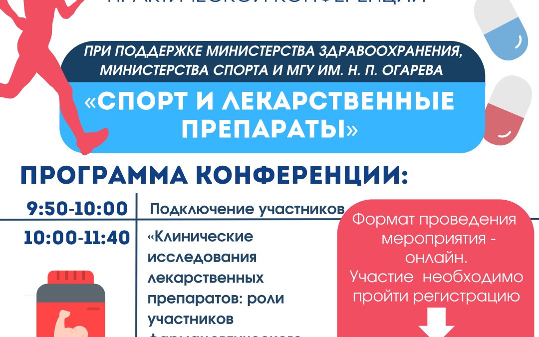 12 июля 2023 года в 10:00 по мск при поддержке Министерства здравоохранения РМ, Министерства спорта, молодежной политики и туризма РМ, МГУ им. Н.П.Огарева состоится Российская научно-практическая Конференция «Спорт и лекарственные препараты».