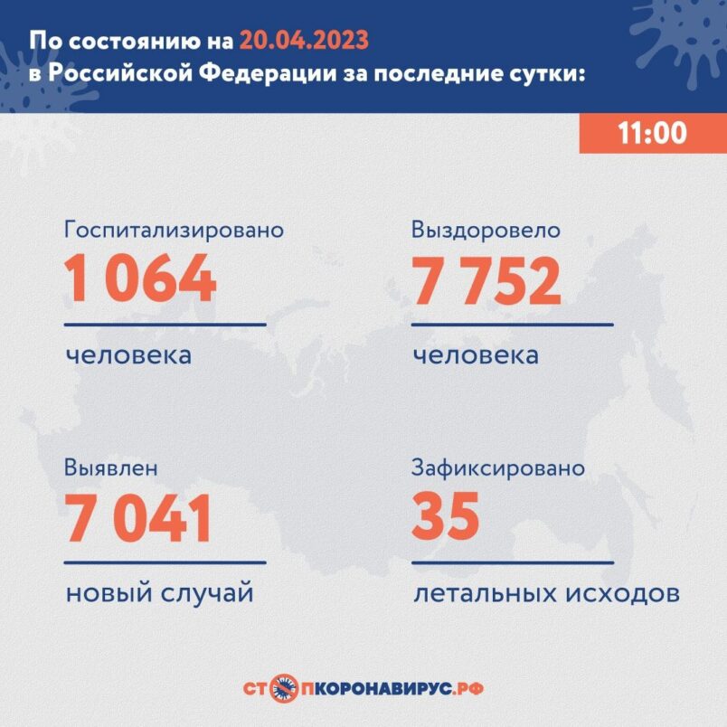 В России за сутки госпитализированы 1 064 человека, выписаны в связи с выздоровлением — 7 752, выявлен 7 041 новый случай COVID-19, подтверждены 35 летальных исходов.