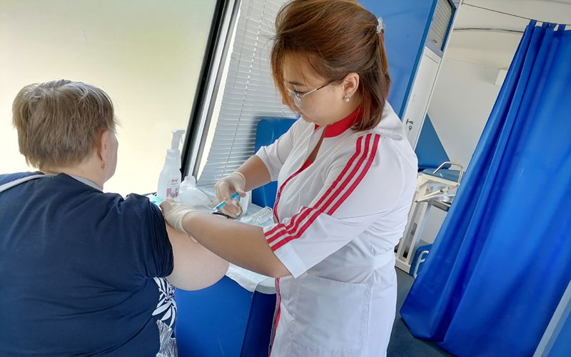 Терапевт Республиканской клинической больницы №5 Оксана Пьянзова для начала расспрашивает о самочувствии, выясняет, нет ли непереносимости куриного белка, не наблюдалось ли аллергической реакции ранее при введении вакцины. Как положено, измеряет мне температуру, артериальное давление. Заодно напоминает, дескать, желательно пройти регулярную профилактическую диспансеризацию. Кстати, начать можно здесь же в передвижном ФАПе.