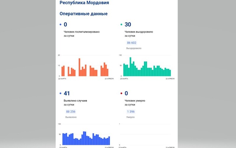 По данным портала стопкоронавирус.рф на 23 апреля, в республике с начала пандемии зафиксировано 88 256 случаев заражения ковидом, выздоровели 86 602 человека, 1396 — скончались.