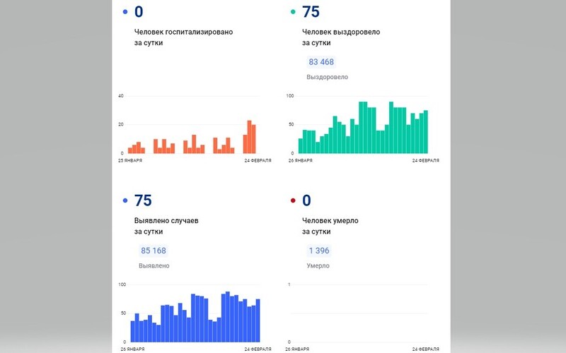 По данным портала стопкоронавирус.рф на 24 февраля, в республике с начала пандемии зафиксировано 85 168 случаев заражения ковидом, выздоровели 83 468 человек, 1396 — скончались.